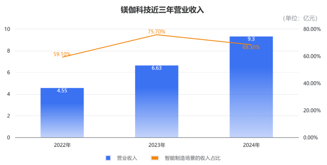 截至2024岁尾,镁伽科技曾经办事跨越880家客户,2022年新增客户的复购率为74%,收入留存率达115%,表示出较高的客户粘性。而且这些合做伙伴不乏全球巨头,例如制药范畴的药明康德,制制范畴的博世,这两大客户仍是公司的计谋投资方,代表了两大范畴对镁伽的承认。2022年到2024年,镁伽的停业收入别离为4。55亿元、6。63亿元、9。3亿元,复合年增加率达43。0%。2022年到2024年,来自智能制制场景的收入,别离占同期总收入的59。1%、
